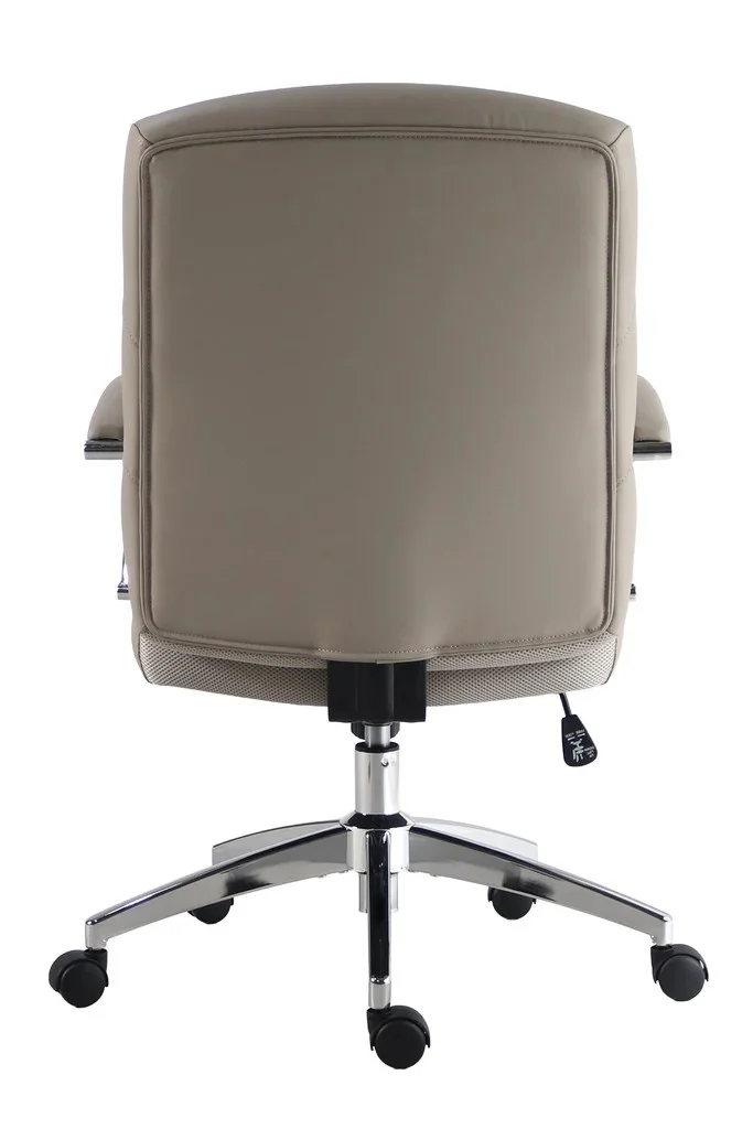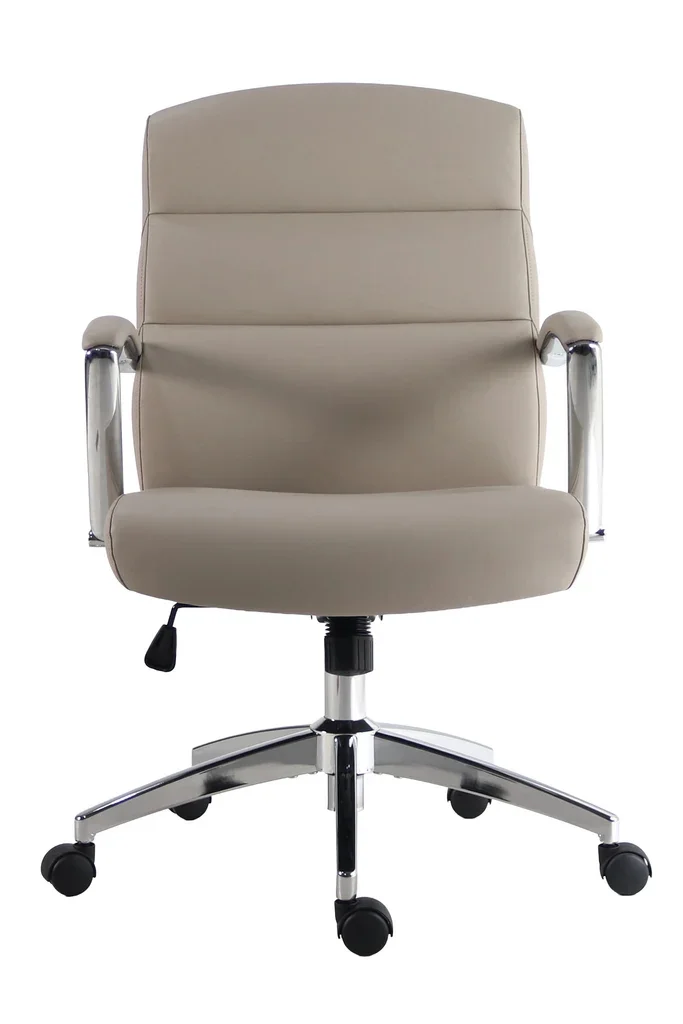 360-degree swivel with tilting recline, Air-lift mechanism adjusts height from 37.5” to 40.5”, Horizontally channeled backrest adds visual structure, Gently curved armrests with polished chrome supports, Five-star chrome base with double-wheel BIFMA rated casters, Ultra-soft vegan leather with 3 year warranty