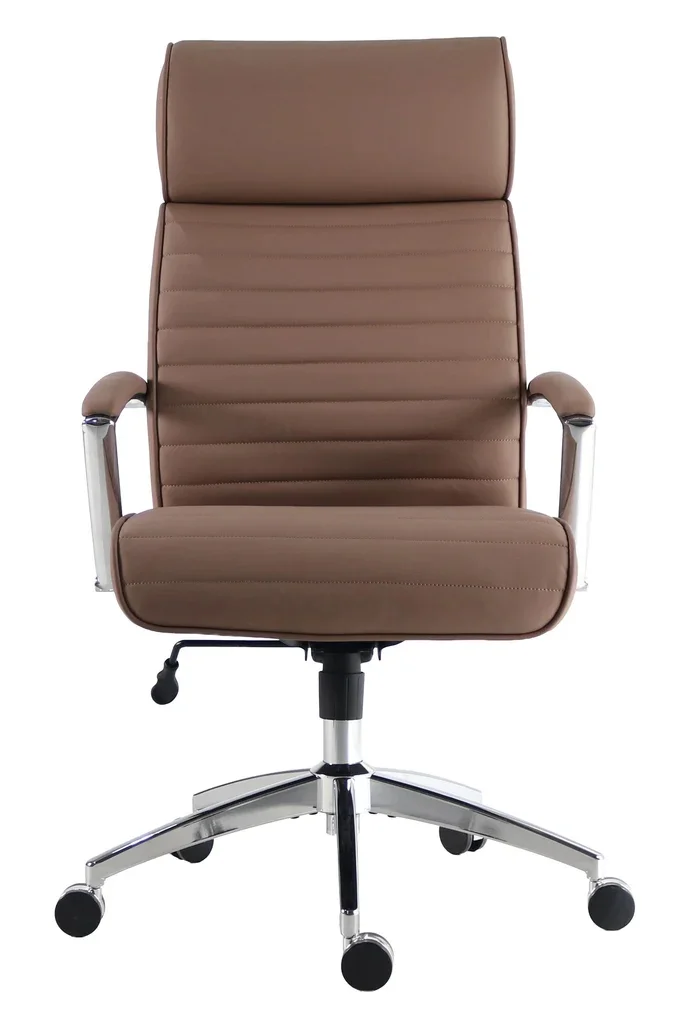 moreThis desk chair combines tailored style with all-day comfort, upholstered in ultra-soft vegan leather and backed by a 3-year warranty. Horizontally channeled detailing adds refined texture, while a plush, generously padded seat, supportive back, and integrated headrest create a relaxed, sink-in feel. Smooth swivel, tilting recline, and easy height adjustment keep you moving comfortably, all grounded by a sleek five-star chrome base with durable double-wheel casters for effortless mobility.